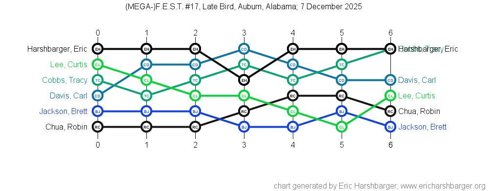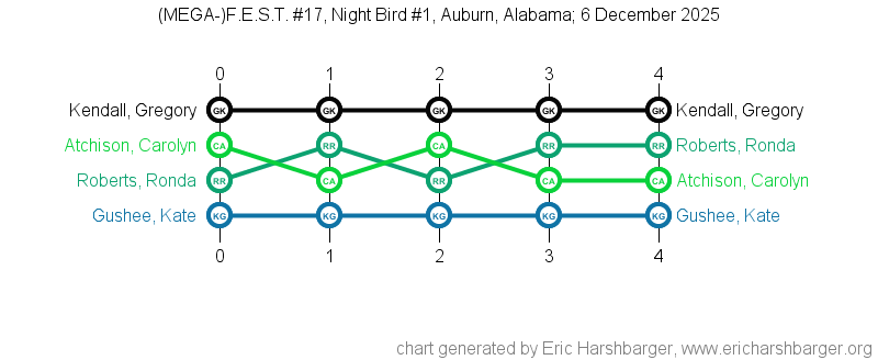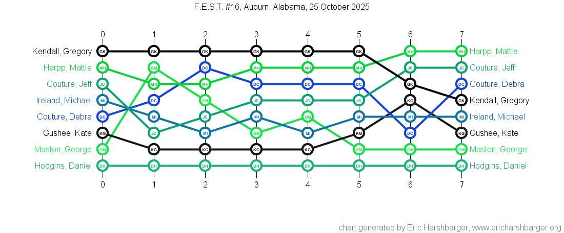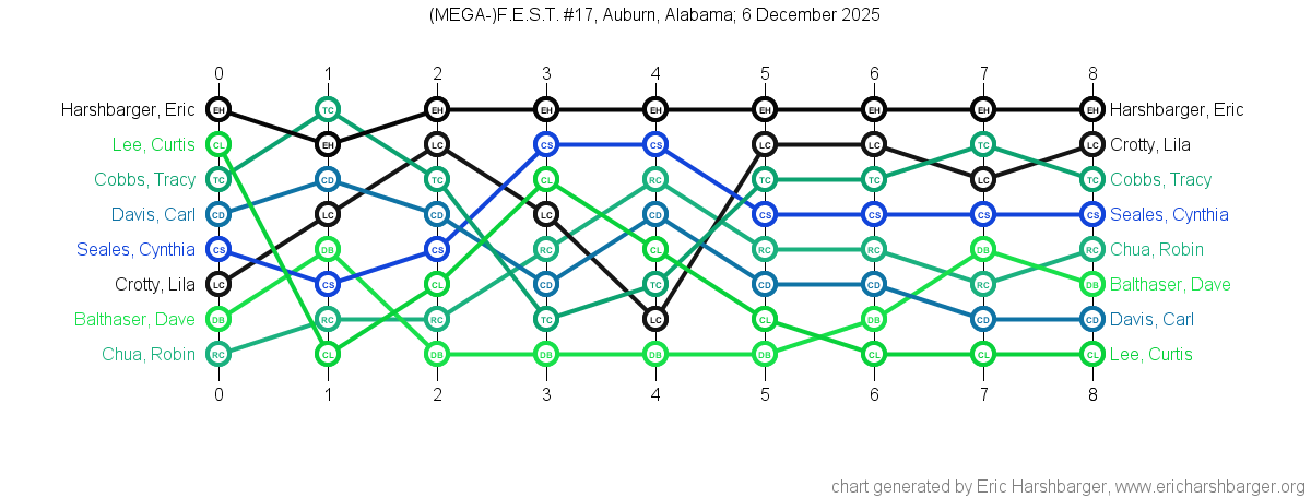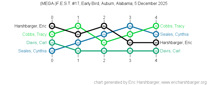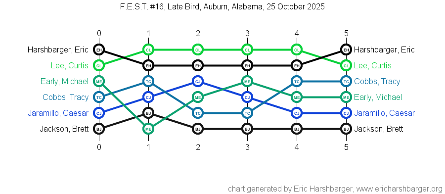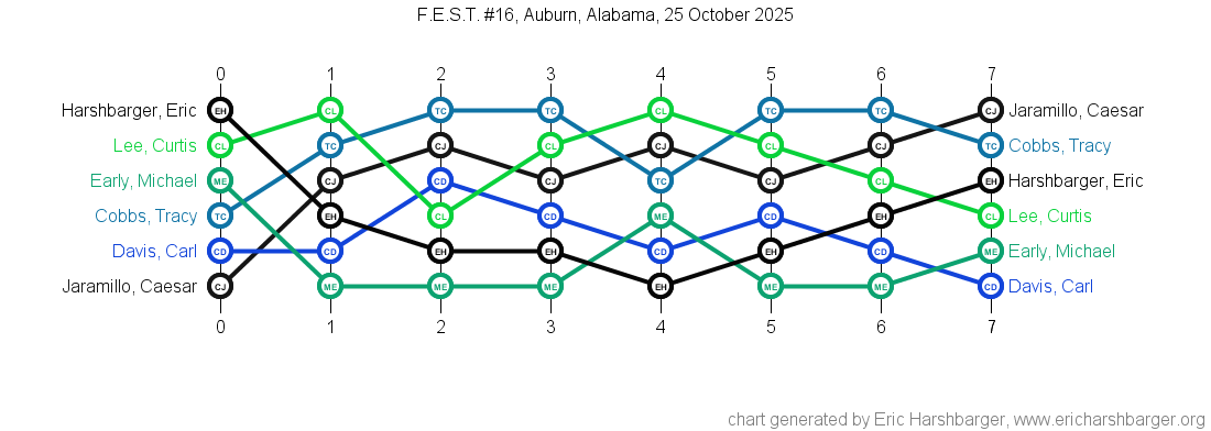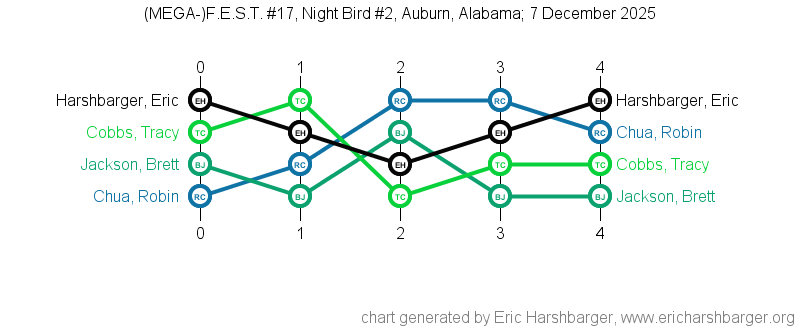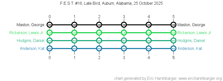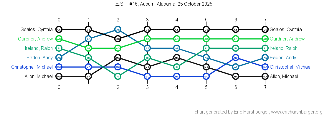 Past "Friendly East-Alabama Scrabble Tournaments" (F.E.S.T.s) that I have directed are listed below (with the most recent at the top of the list).